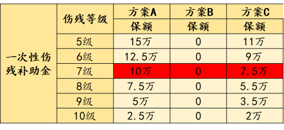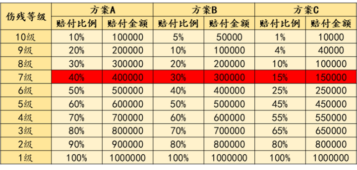 在李某的案例中,虽然都是100万的总保额,但是因为伤残等级赔付的比例不同,造成最终获得赔偿金额的巨大差异。 方案A获得40万赔偿,方案B赔偿30万,方案C只有15万,最多相差了25万