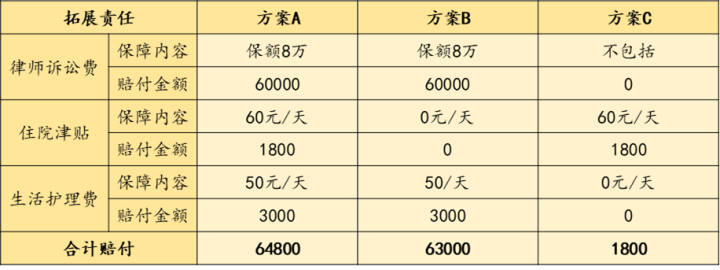 在李某的案例中,因为扩展责任的不同,最终方案A赔付64800元,方案B赔付63000元,方案C赔付1800元。 相比方案A,方案B企业需多支出1000元,方案C企业需多支出63000元