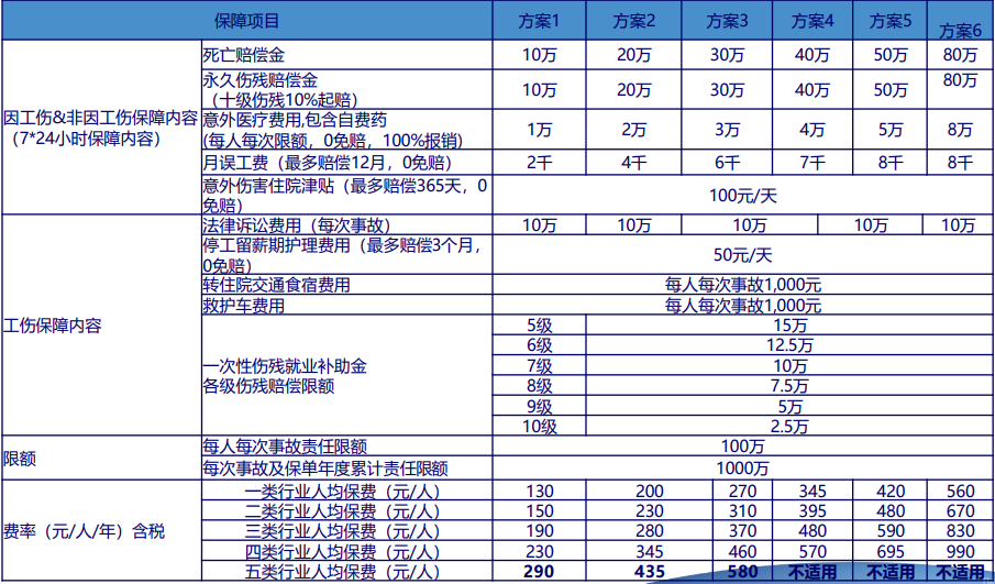 - 7*24小时责任:附加该责任后,非工伤造成的死亡伤残也能获得赔付,责任好的还扩展非工伤医疗费、误工费、住院津贴等