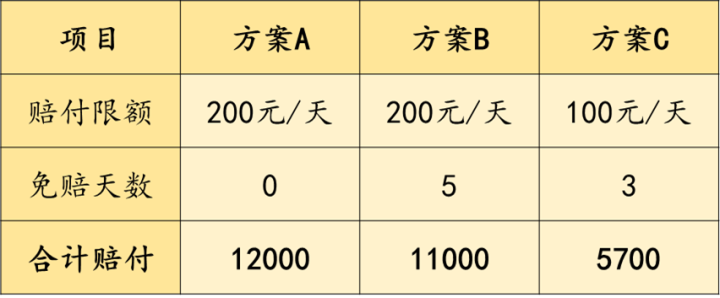 在李某的案例中,因为误工费的赔付限额以及免赔天数的不同,最终方案A赔付12000元,方案B赔付1100元,方案C赔付5700元。 相比方案A,方案B企业需多支出1000元,方案C企业需多支出5700元