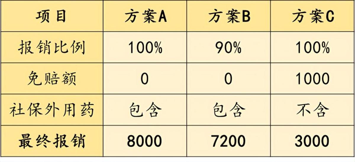 在李某的案例中,因为报销比例,免赔额,社保外用药责任的不同,导致报销的医疗费也有所差距。最终方案A赔付8000元,方案B赔付7200元,方案C赔付3000元。 相比方案A,方案B企业需多支出800元,方案C企业需多支出5000元