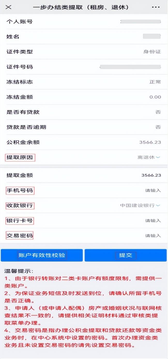 ③返显个人信息后提取原因选择『离退休』。然后输入手机号码,选择收款银行,录入银行卡号、交易密码,点击账户有效性校验,提示账户有效即可。最后点击『提交』。