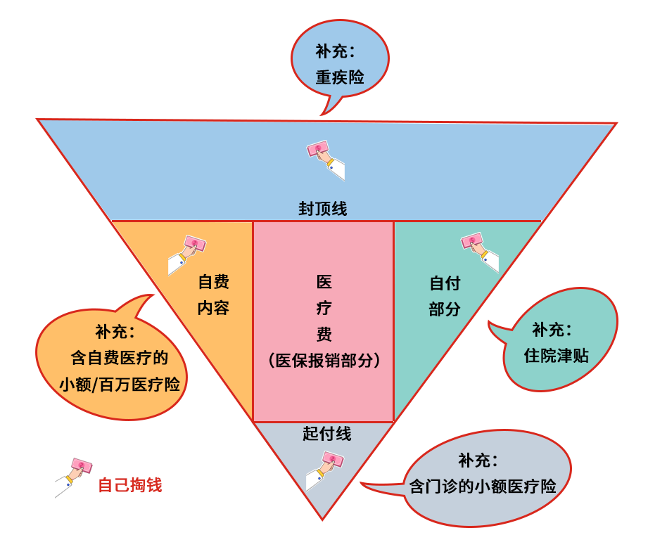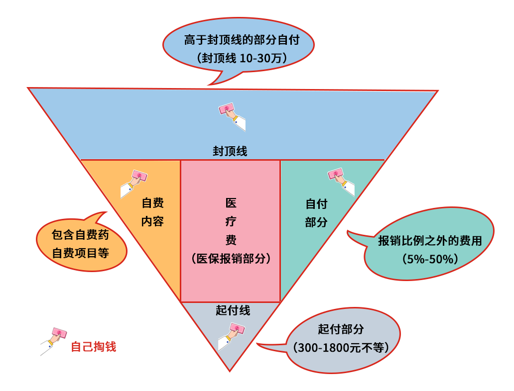 所以,把总医疗费当成一个倒三角的话,其实最终我们报销的部分就是最中间红色区域“医疗报销费”,而一旦生大病,其他部分的不报销,依然是大多数普通家庭难以承受之重。