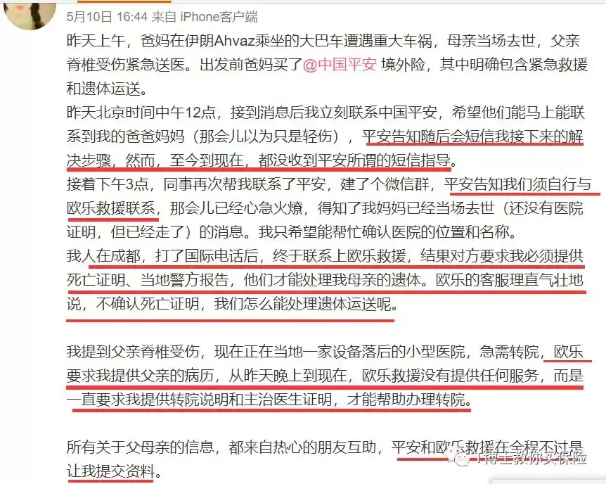 平心而论,不管是遗体运返,还是医疗转运,需要提供的资料是没有错的,但是不应该让身在成都的博主提供,而是由紧急救援提供方(平安的是欧乐救援)与伊朗的医院或警方直接联系,如果需要,必须第一时间去医院评估博主父亲是否可以医疗转运、办理博主妈妈遗体送返的手续。所以,说平安这次服务不力没冤枉它。
