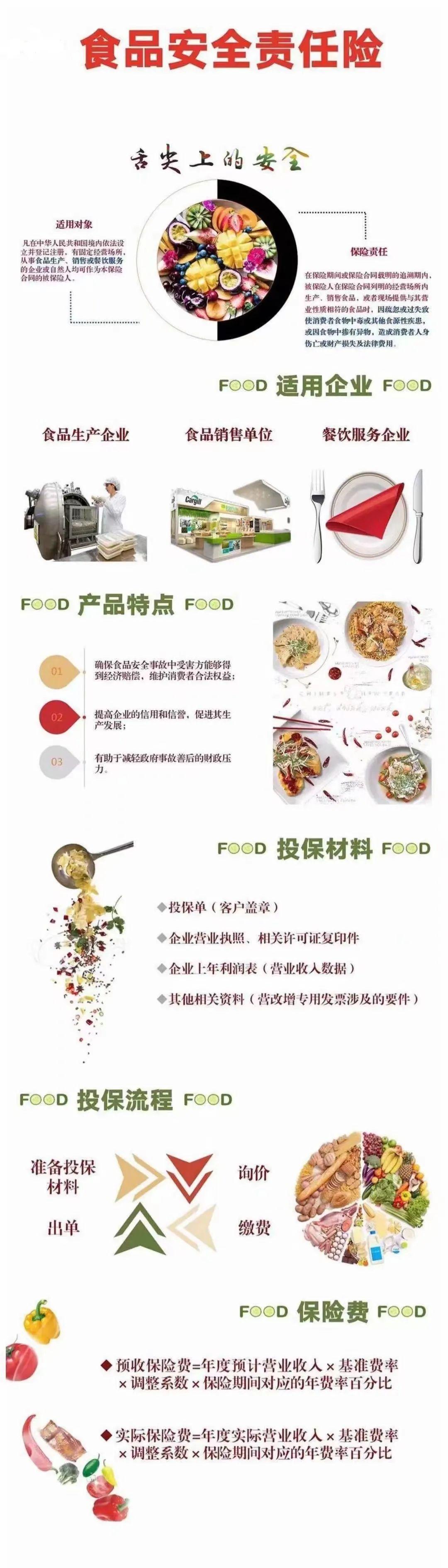 食品安全责任保险主要保障:由于被保险人的疏忽、过失,导致第三者在食用被保险人提供的食品后出现下列情形,