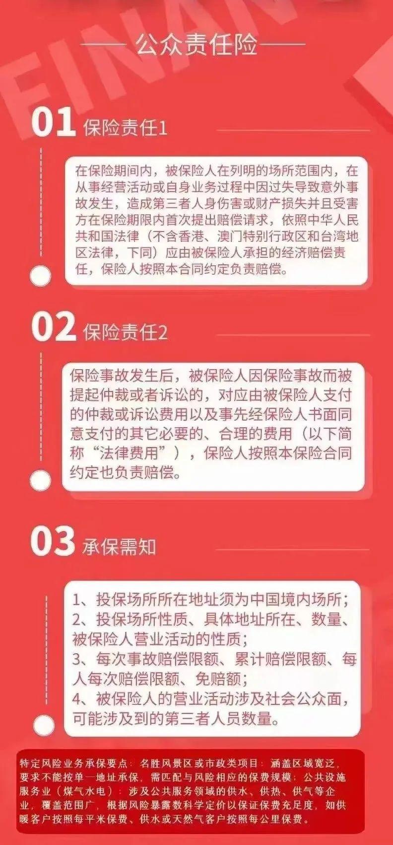 公众责任险用于转移企业经营中面临第三者的责任风险,减少不必要的麻烦及经济损失,责任范围广,保障充分,且包含法律费用。