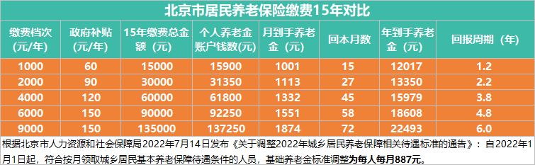 还是以北京2022年城乡居民基本养老保险缴费标准来举例,在不考虑利息收入、缴费档次变化、基础养老金调整、通货膨胀等因素的影响下,从图中可以看到,按照最低缴费档次1000元/年缴费的,只需要1年多就能回本了,当然领回本之后还可以继续按月领取养老金待遇。
