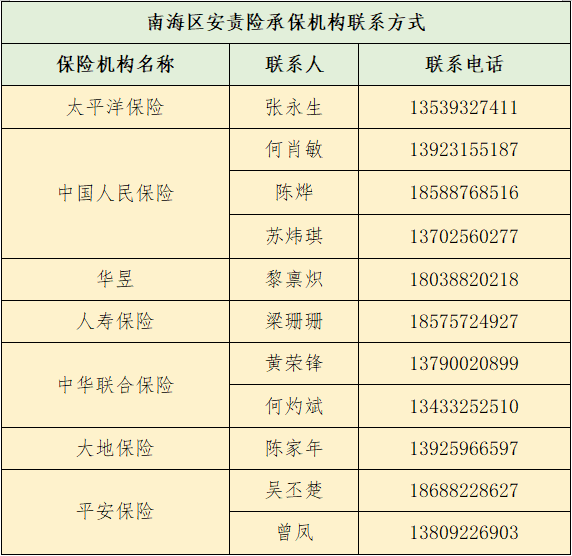 备注:此名单上的保险机构均可承保,联系人仅供参考,企业可自行联系其他保险业务员投保。