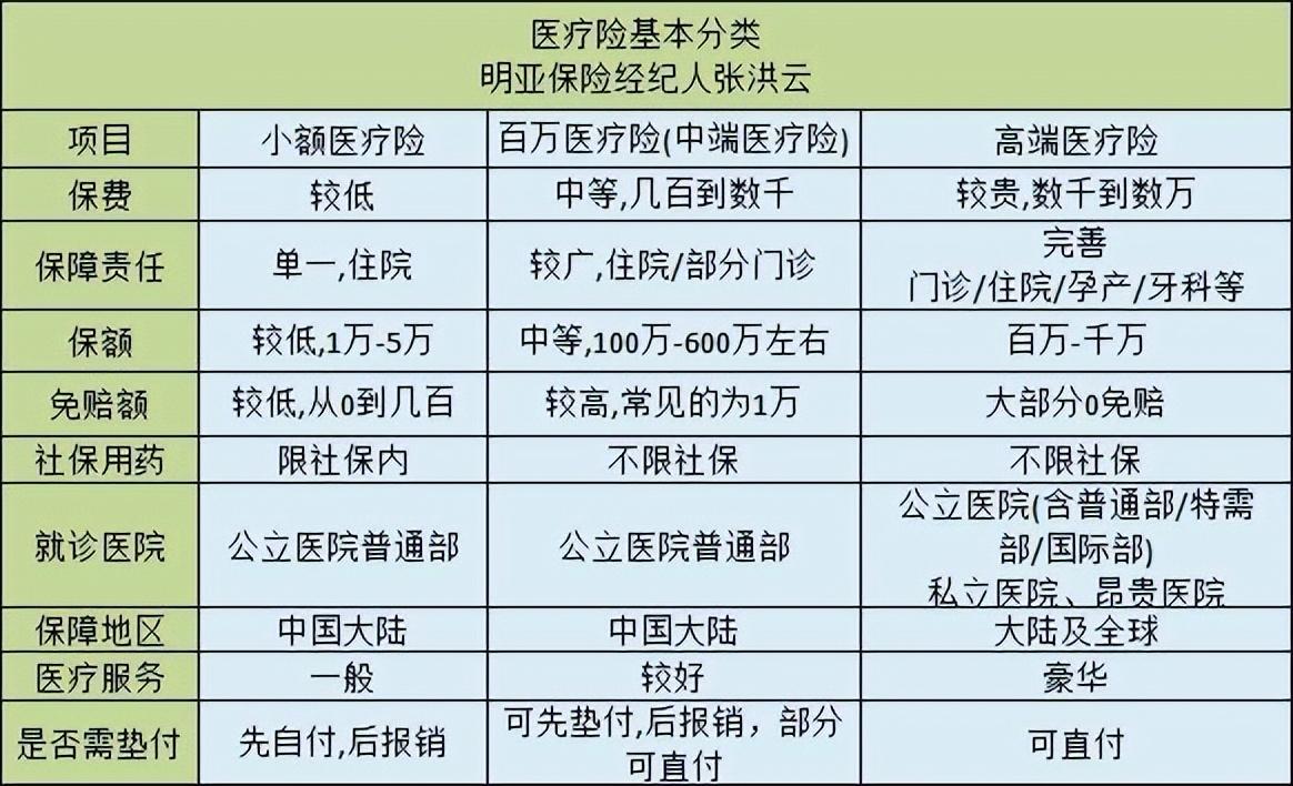 涵盖小额医疗和百万医疗的责任,可以解决所有的医疗费用支出,可以扩展到公立医院的特需部、VIP部就诊,可以附加门诊责任,保费也相对较贵。