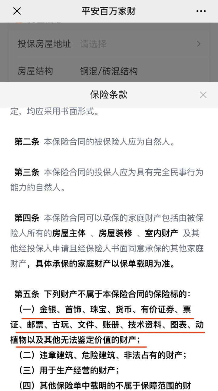 保险条款明确指出金银、首饰等财产不在保险范畴。来源网络截图