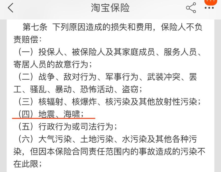 保险免责条款里明确地震、海啸不保。来源网络截图