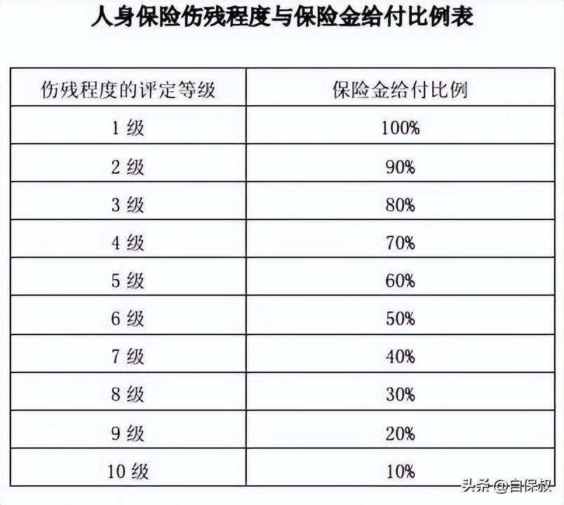 比如10级伤残,就会按意外险基础保额的10%赔付;1级伤残,就会赔100%。