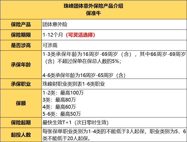 这款团体意外保险可承保1-6类职业,且支持涉高工种投保,对高风险用工企业来说很友好。