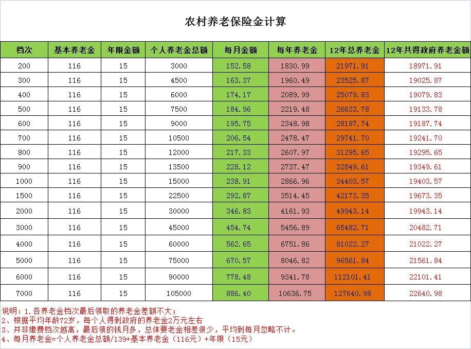 1.各养老金档次不管缴纳高还是低,最后领取的养老金实际差额不大,以领满12年(72岁)计算,最低档200元档,一共多赚政府养老金18971.91元,最高档次7000元,共领取政府养老金22640.98元,最低和最高档次缴费实际领取国家养老金只相差3669元,实际每月多领的只是自己投入的本金。