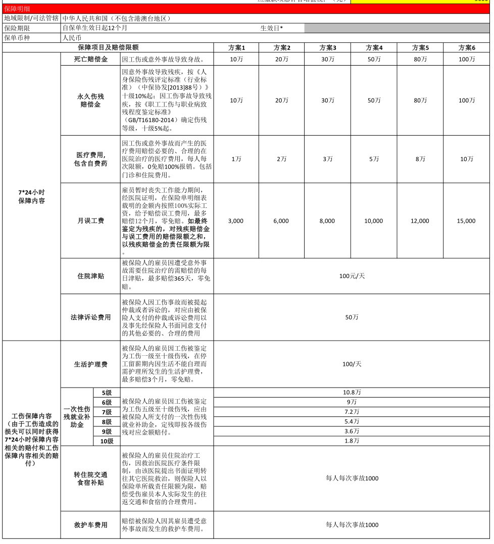 - 保障覆盖面——能否保障意外休假期间的工资发放,意外医疗有多少,产生了纠纷有无法律诉讼费用补偿……?