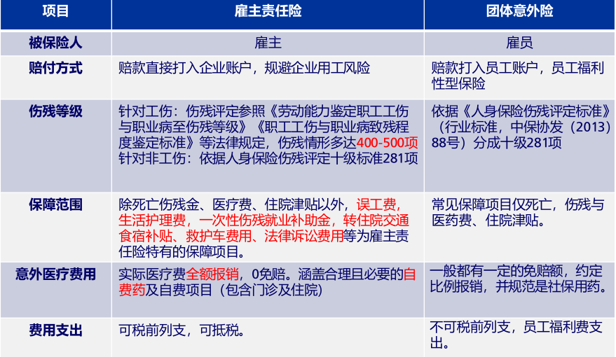通常雇主责任险十级伤残为10%或至少5%,而团体意外险可能低至0.1%;九级雇主责任险20%,团体意外险可能是0.5%(这是非常大的差距)。