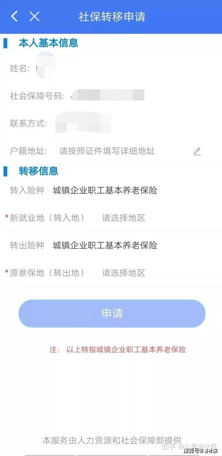 第三步:在跳出的新页面中,输入申请人的个人基本信息即:姓名、社会保障号码(身份证号码)、联系电话、户籍地址和转移信息;