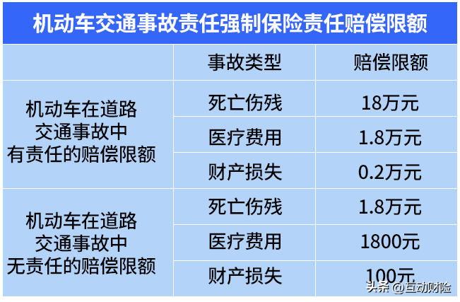 被保险人无责任时,无责任死亡伤残赔偿限额为18000元,无责任医疗费用赔偿限额为1800元,无责任财产损失赔偿限额为100元。
