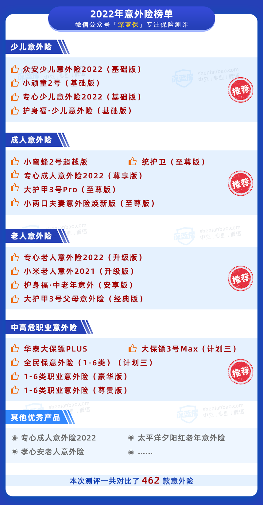 本期榜单,我们对比了462款意外险,并从中挑选出优秀的产品,大家可以根据自己的情况合理选择,内容主要分为4部分: