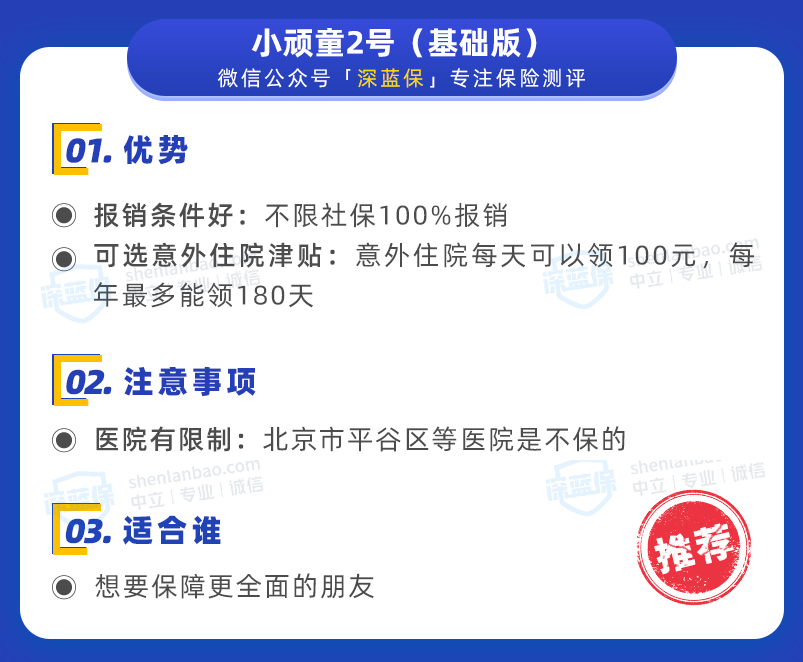 小顽童2号(基础版)整体保障都很优秀,还能附加住院津贴的保障。我们总结了它的情况: