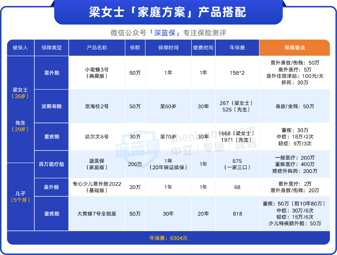 我们只花了6304元,就给梁女士一家配齐了保险,而且保额买的比较高,能给他们提供不错的保障。