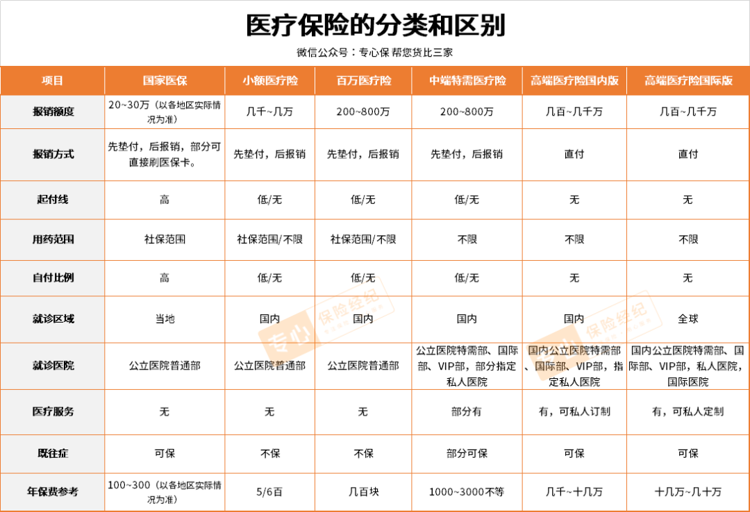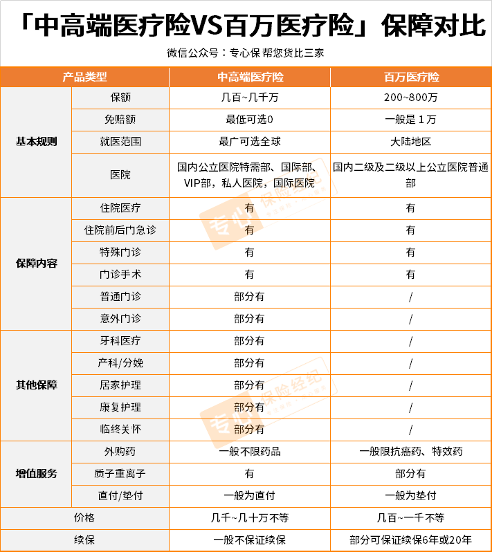 为了让大家更直观地感受,我拿百万医疗险跟中高端医疗险做个详细的对比: