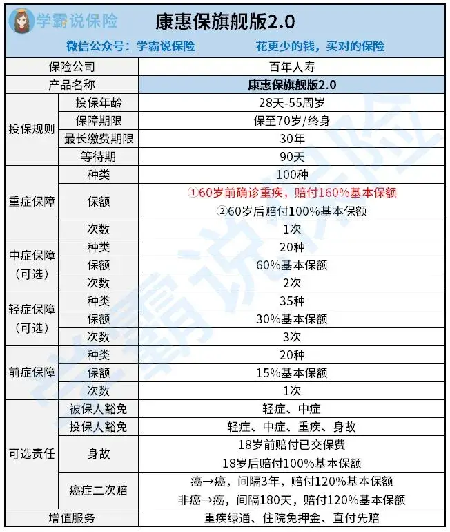 目前市面上热销的消费型重疾险中,百年人寿的康惠保旗舰版2.0较为出色。