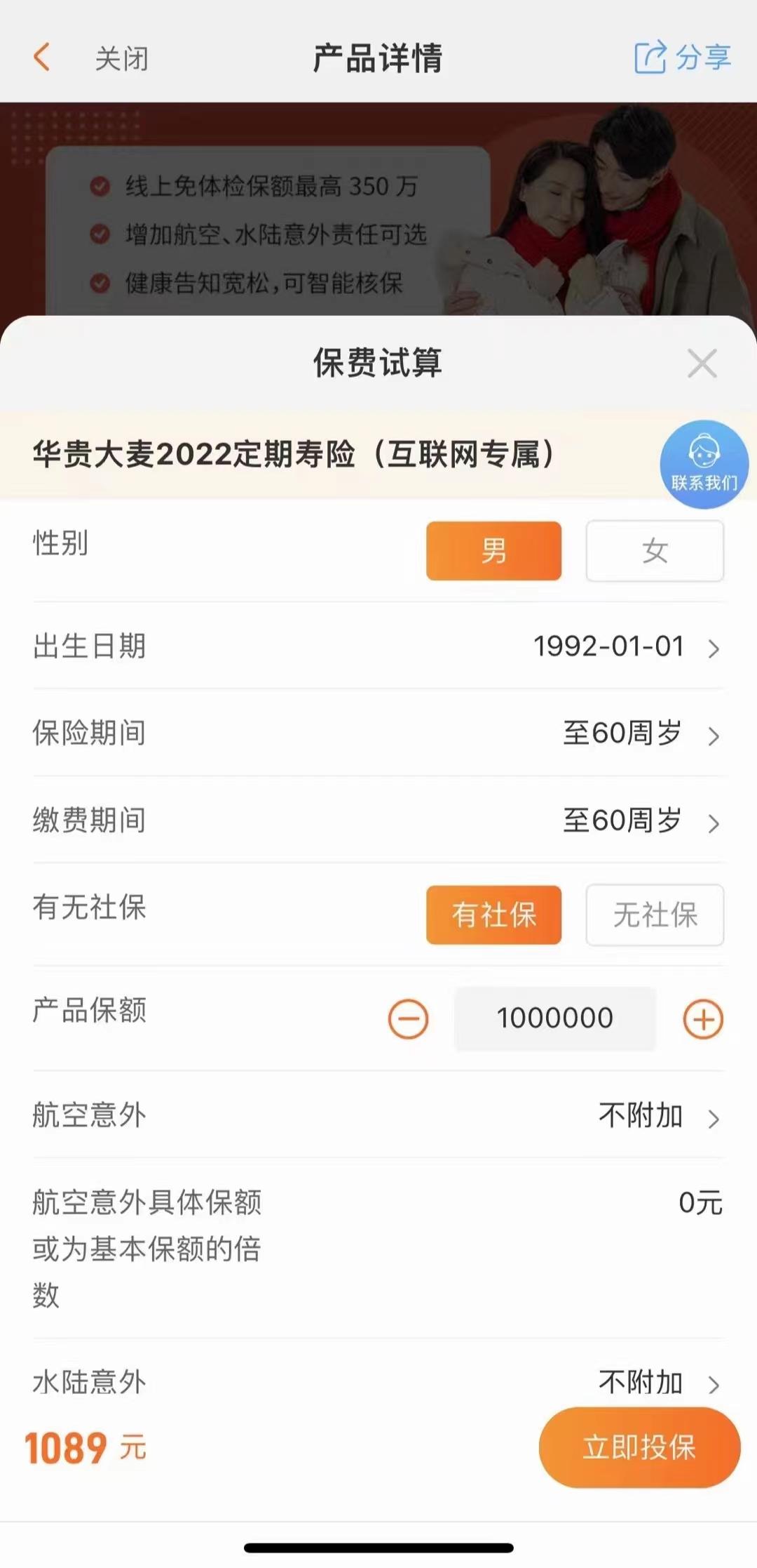 举例:30岁男,有社保,保额100万,缴费到60岁,每年保费只需要1089元。