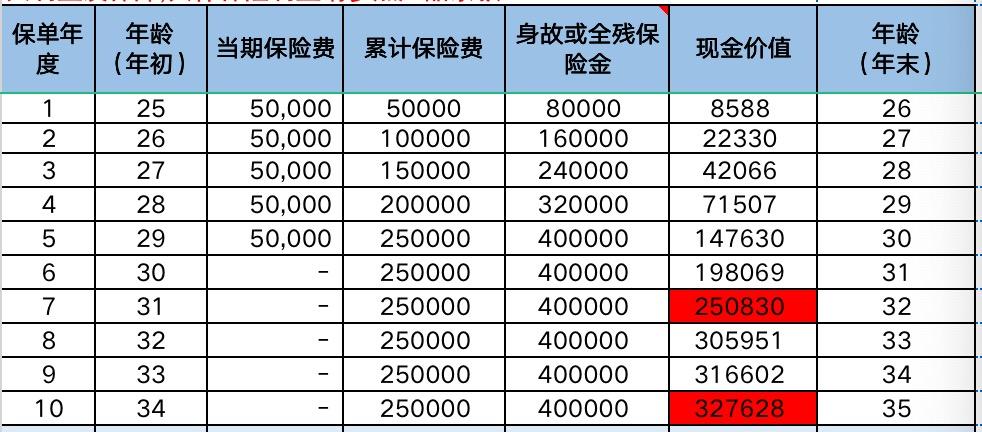 举例:25岁男,5年缴费,年交5万,一共缴费25万,能领多少钱?