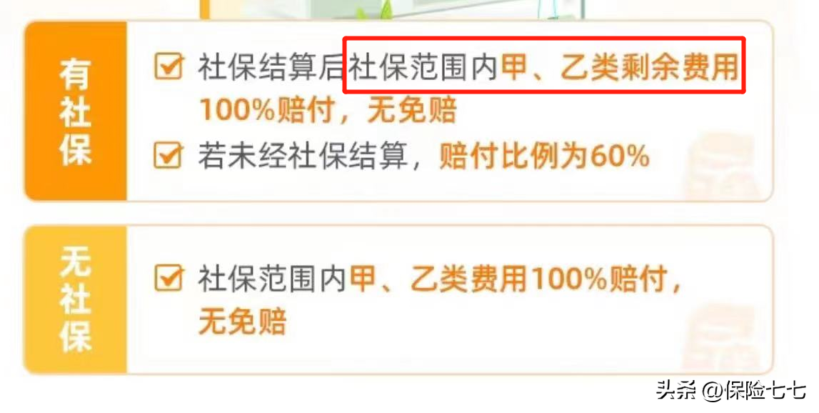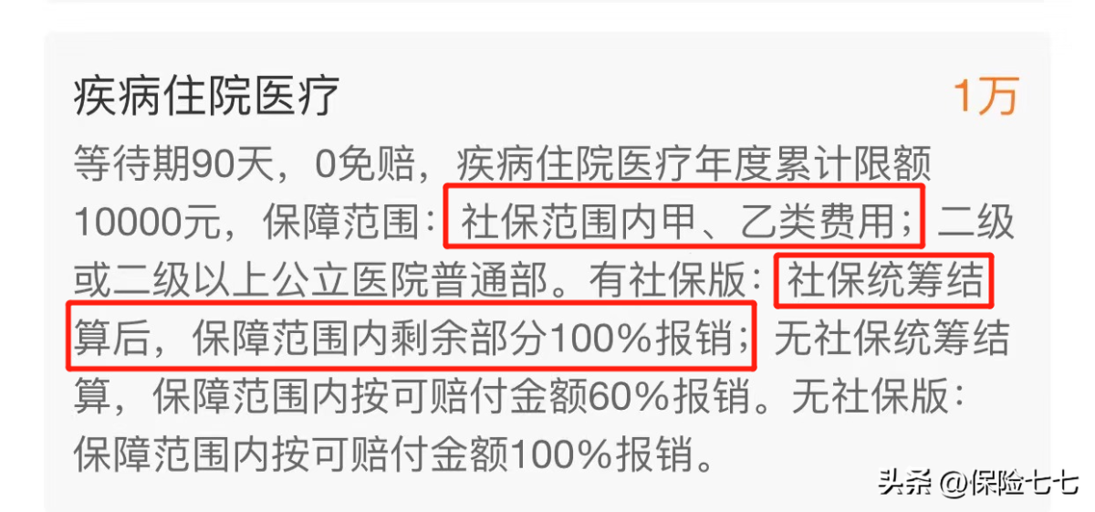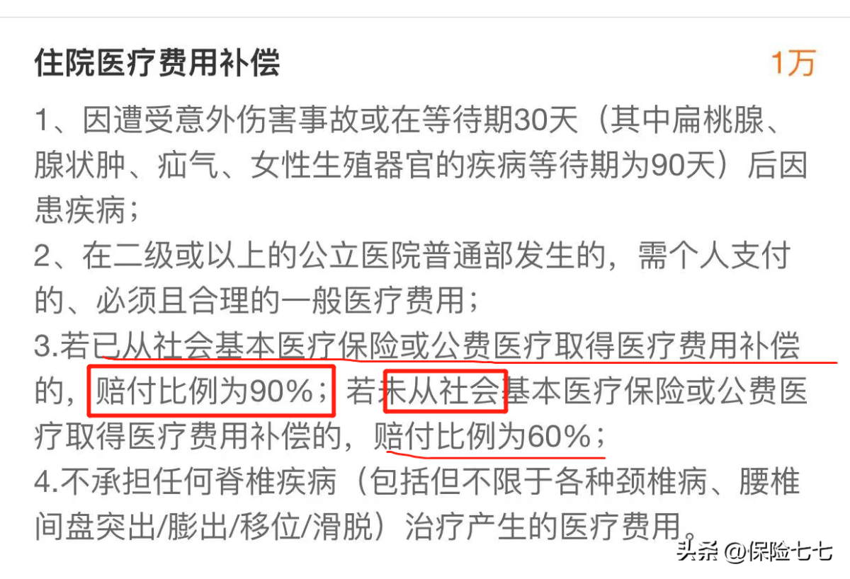 一般报销比例都是写进特约,看免赔额和报销比例,需要社保的配合,先走社保的报销比例高,如下图,走社保后可报90%,没走社保的报销比例低,如下图,只能报60%。