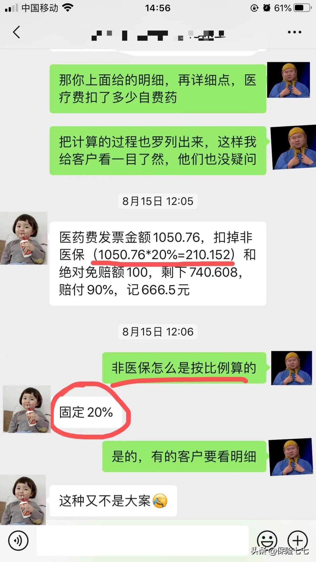 但理论终究是理论,实际理赔的时候,消费者们一定要自己关注下理赔明细,因为我比较严谨,每次帮客户理赔都要理赔明细,核对理赔金额,果然发现猫腻,非医保用药属于自费药,是按药品明细扣除不赔的,但这家分支机构按总金额的固定20%比例扣除赔付,很明显降低了赔付金额,等于条款上90%赔付,他们降为了70%赔付,这在条款上是没有体现的,只有专业人士才能分辨出来,细心点问清楚每笔明细很重要。