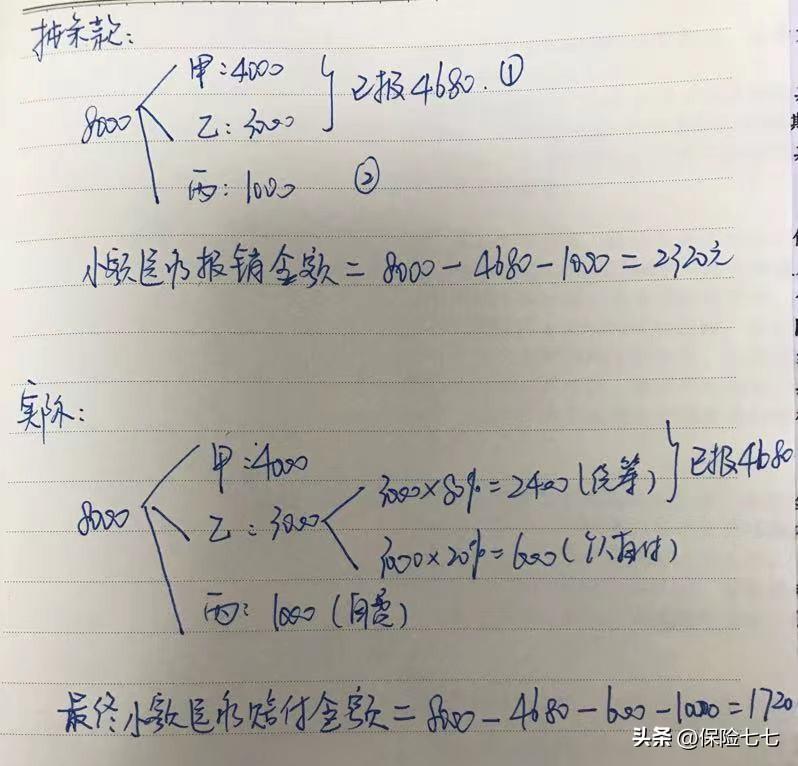 可实际上赔付金额=8000-4680-3000×20%(个人自付)-1000(自费部分)=1720元,看出哪里不一样了吗?