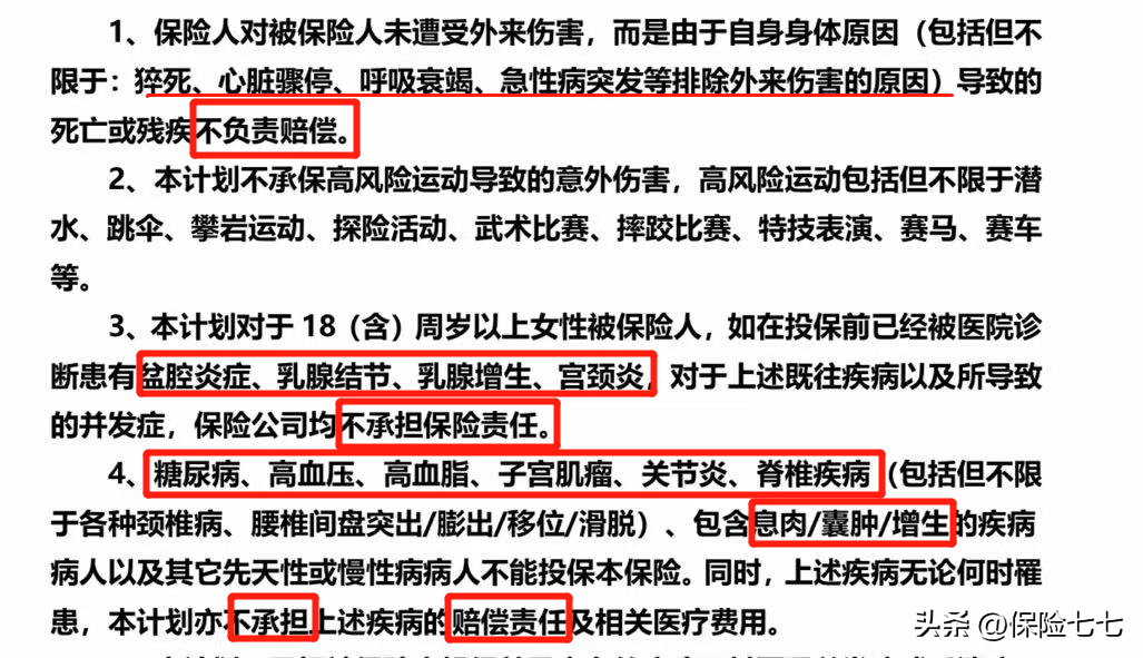 一般保障内容,我们只要看免责条款,就知道哪些是不赔的,剩下的都是赔付的,但小额医疗,在投保须知或特别约定里,增加了免责条款,如果没有关注的人,恰巧生了免责条款里的疾病,是拒赔的。(这些都是常见高发病种,保司为了降低赔付风险,固除外,看似价格不贵,其实保障内容已经打折)