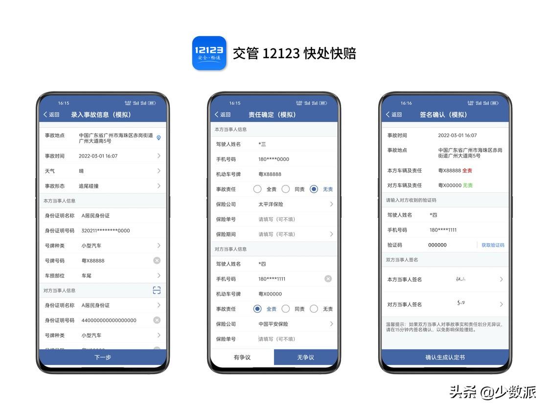 在手机中,下载、安装「交管 12123 app」。登录后,点击首页中的「事故快处」。快处快赔分为三部分 —— 现场取证、信息录入、责任协商。