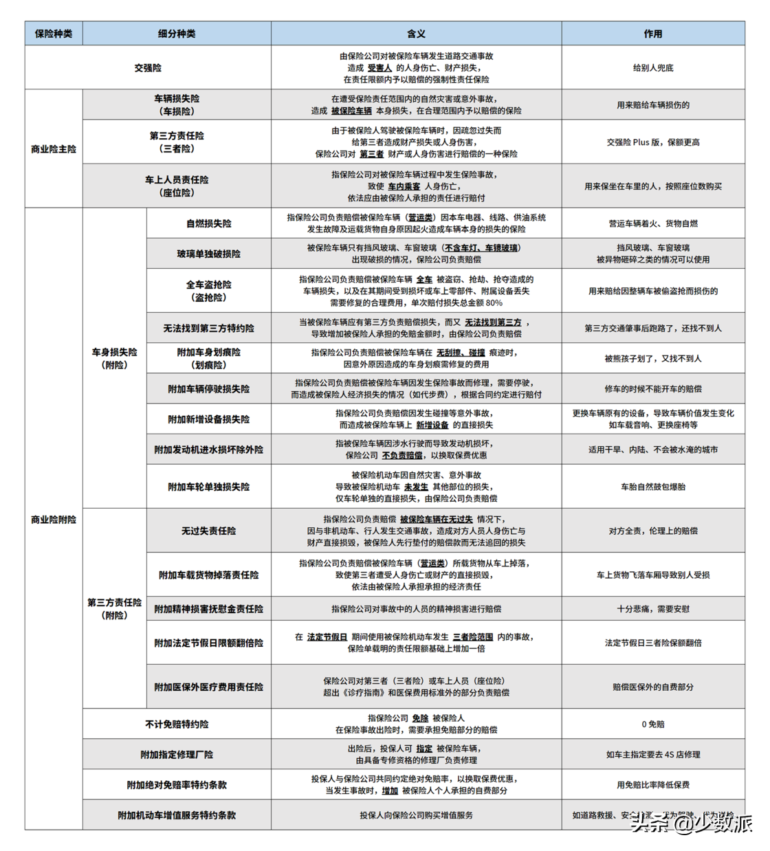 对不同险种的配比,决定了保险公司的赔付责任,以及最重要的商业险保费。首先我们需要理解每一项保险的含义,及其赔付范围。