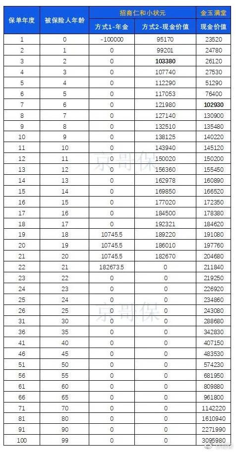 我将趸交10万元,分别买小状元和金玉满堂(一款比较优秀的增额终身寿险)作了对比,如下图。