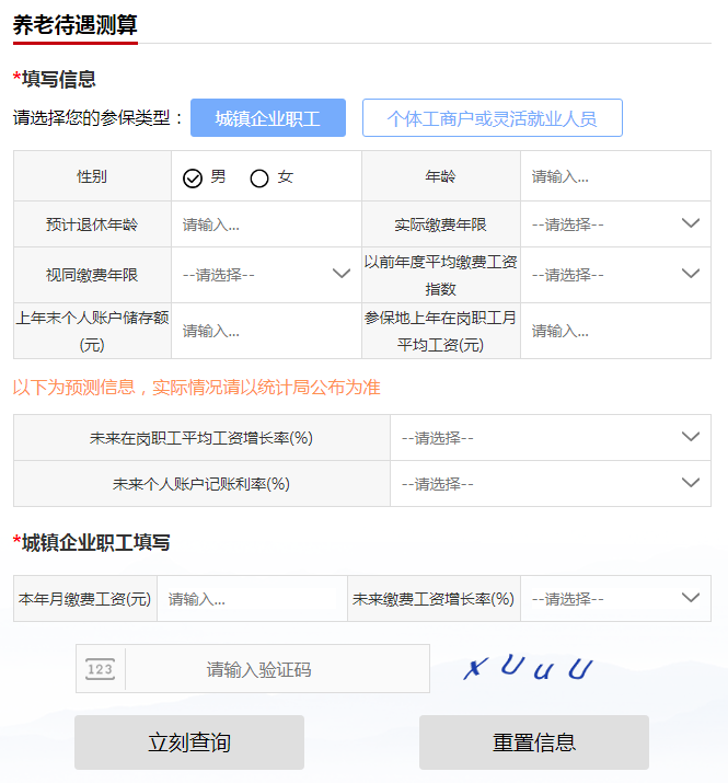 以上信息填写完成后,填写验证码,之后点击「立刻查询」,就可以测算出退休时每月可以领取的养老金。