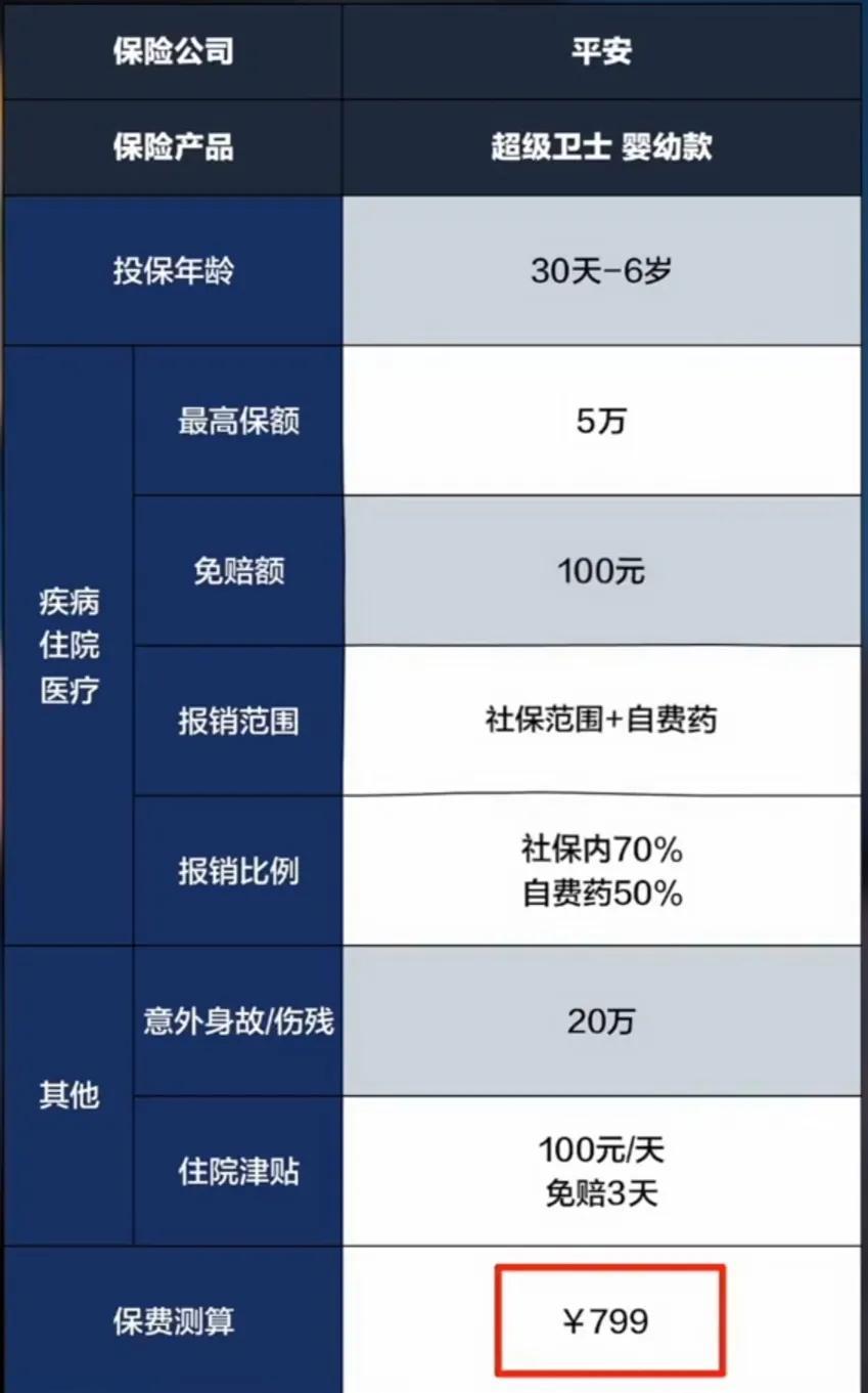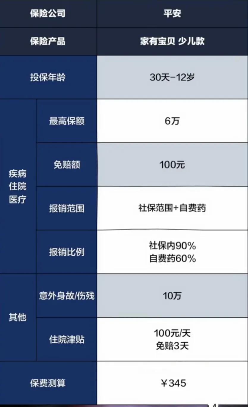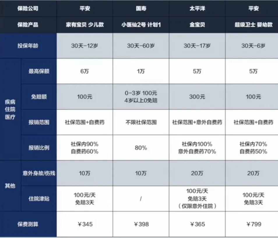 保费365, 5万的住院医疗。0到3岁呢有300的免赔,相对来说是比较高的。虽然社保内100%报销,但是自费药报销仅限于意外医疗,相对来说保障内容又弱了一些。