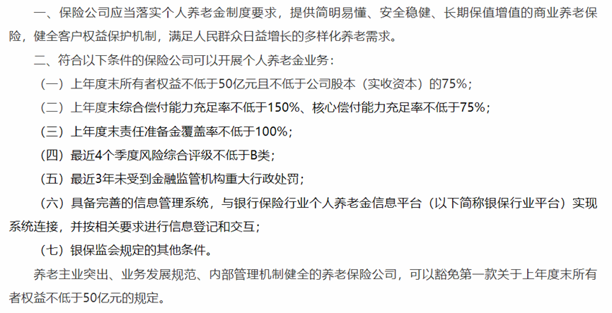 值得一提的是,《通知》也让更多“小而美”的保险公司得以有机会参与到个人养老金市场的建设中来。相较于征求意见稿,《通知》还新增一条重要内容,养老主业突出、业务发展规范、内部管理机制健全的养老保险公司,可以豁免“上年度末所有者权益不低于50亿元且不低于公司股本(实收资本)的75%”的规定。