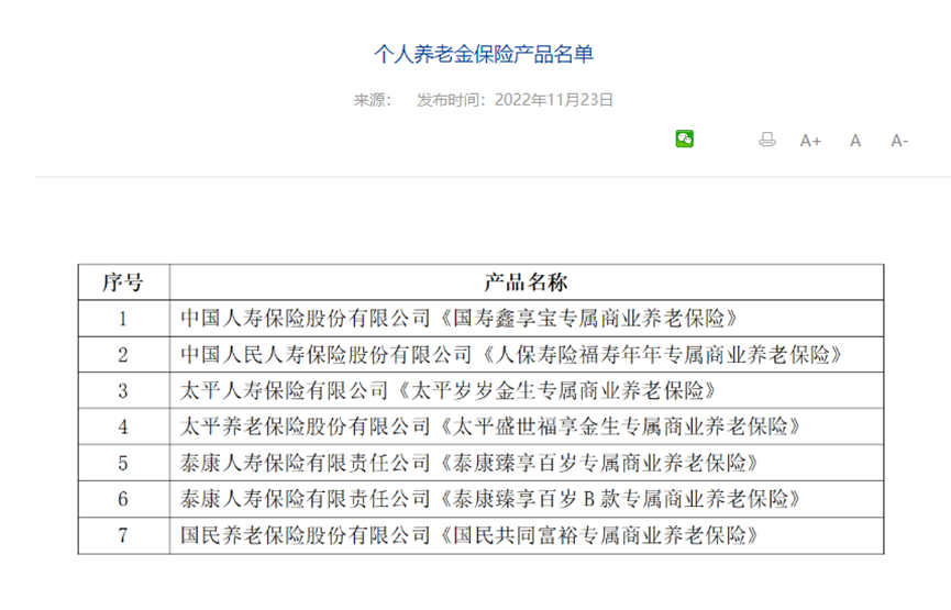 名单包含个人养老金保险产品名单包含6家保险公司的7支产品,产品均为专属商业养老保险。