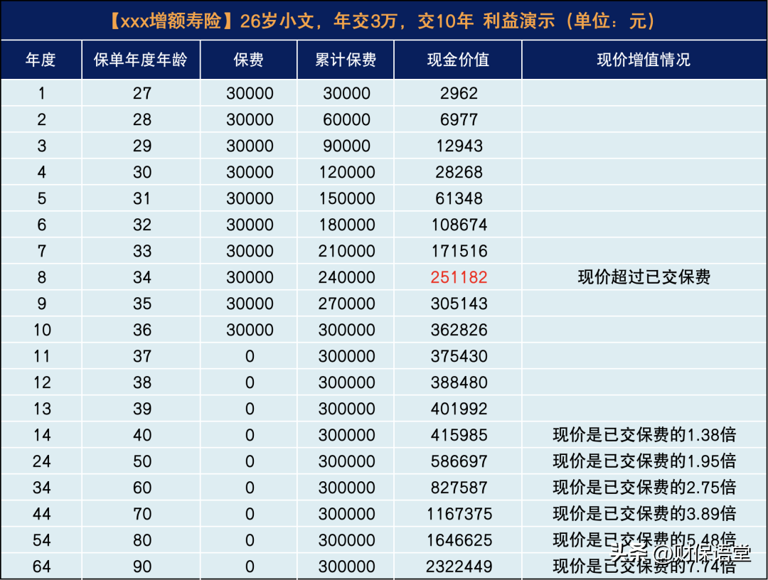 算下来,也就是每个月节省下两千五,这对小文来说不难做到,一共交10年,总保费是30万。