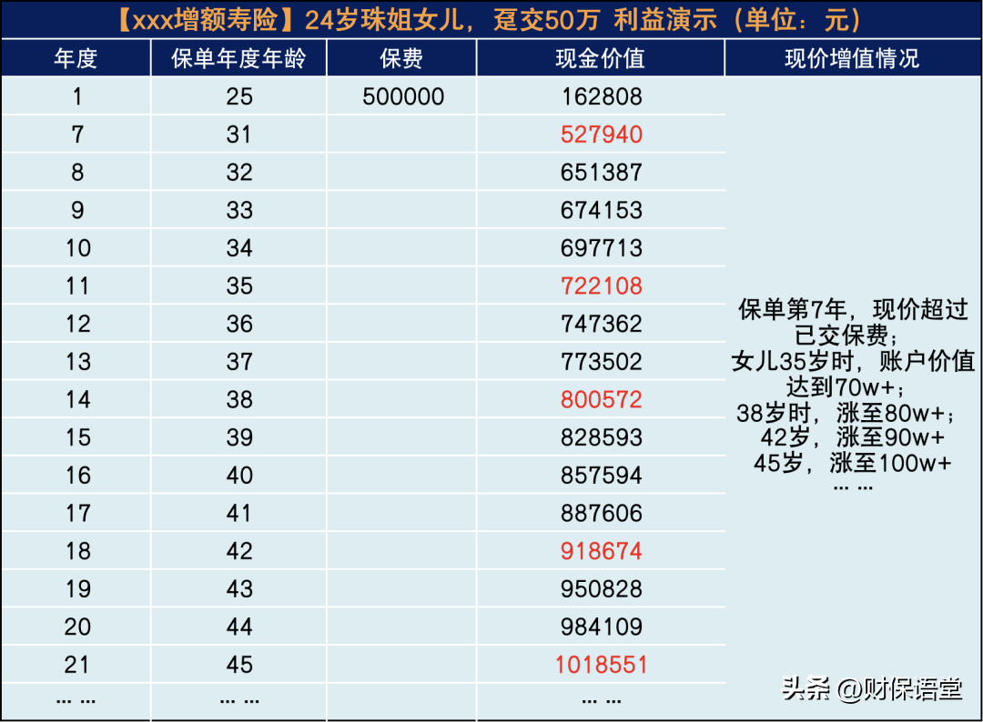 到女儿45岁,这笔钱将涨到101.8w,此时已是已交保费的2倍……