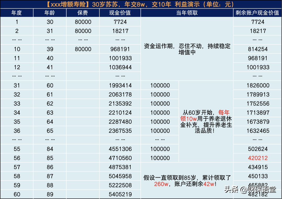 假设苏苏一直按照每年10w减保到85岁,这时已经累计领取了260w,已是已交保费的3.25倍,并且账户还剩余42w。