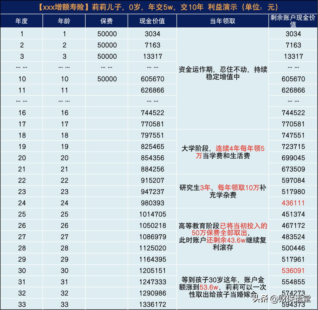 于是她执行了一个年缴5w,缴10年的投保计划,等孩子上大学后再从里面减保取钱出来用。