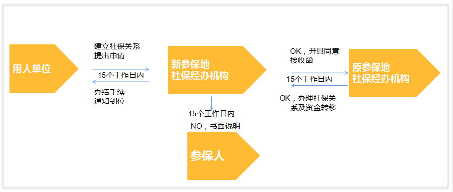 跨省流动就业时,由新单位或本人向新参保地社保经办机构提出转移接续申请,新参保地社保经办机构审核OK,向原参保地社保经办机构开具接收函,原参保地社保经办机构确认无误,转移完社保关系和资金后,新参保地办结手续,就OK了。