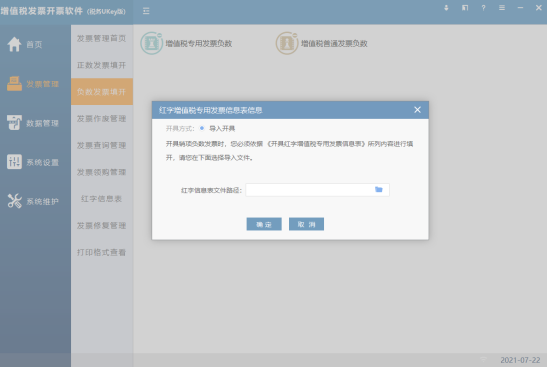 红字发票信息表下载好后,我们就可以开具负数发票了。点击“发票管理——负数发票填写——增值税专用发票负数/增值税普通发票负数”(按照实际选择专票或者普票),导入下载好的红字发票信息表,进行负数发票开具。