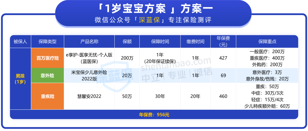 从表格中可以看到,这两套方案的意外险和百万医疗险配置是一样的,主要差别在于重疾险,下面我们来重点分析一下: