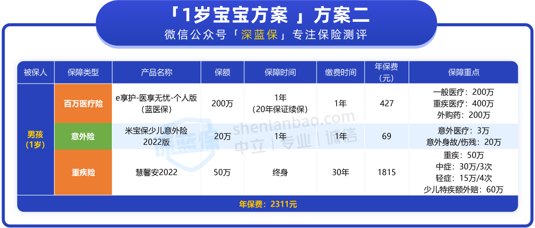 - 方案二:选择了保终身的重疾险,这样孩子一生都能够有一份保障。而且年纪越小越划算,买50万也才不到两千,性价比很高。