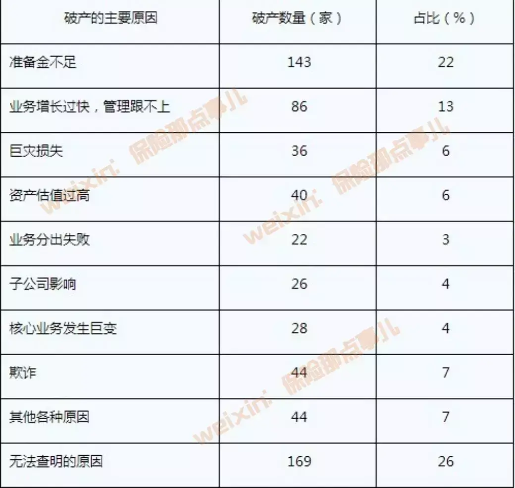 破产的原因也有很多,图为1969—1998年美国保险公司破产原因分析: