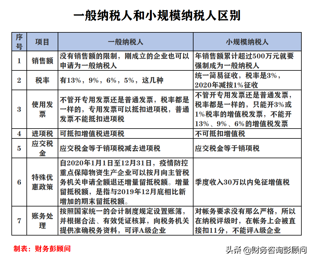 对于小规模纳税人与一般纳税人的区别,我汇总为一个表格,如下所示: